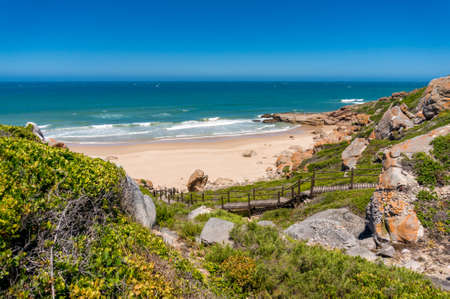 Summer beach nature background with wooden path to sandy beach and rocky coastline. South Africa