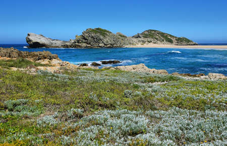 Picturesque seaside landscape with sandy beach and green grassy hills and rocky cliffs. Coastline nature background. Robberg Nature Reserve, South Africa