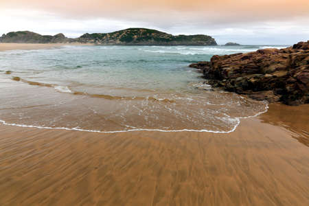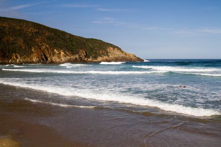 Rough sea and golden sand at the rugged coast in South Africa