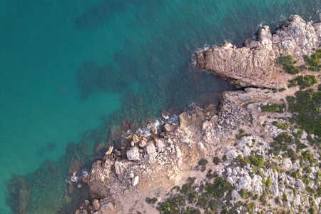Drone fly-by of the Mediterranean Seashore in Spain showing deep blue water and coast rocks