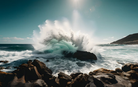 Idyllic seascape breaking waves on rocky coastline, horizon over water generated by artificial intelligence