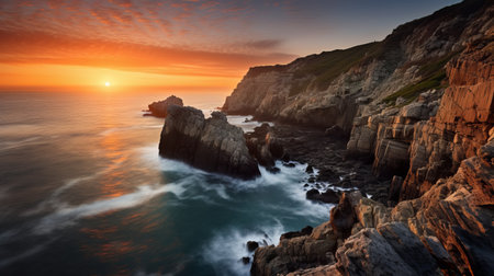 sunrise over the coast from the cliffs below, captured with the carl zeiss distagon t 15mm f/2.8 ze lens. this epic fantasy scene showcases a stunning blend of light bronze and orange hues. the use of the samyang 14mm f/2.8 if ed umc aspherical lens adds a touch of rustic naturalism to the composition. the wide-angle lens creates a large-scale canvas impact. ai generated