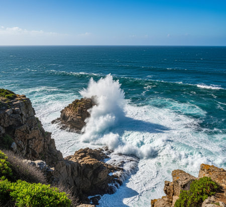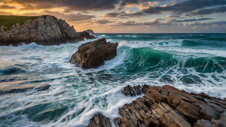 Majestic coastline, breaking waves, rocky cliffs, beauty in nature generated by artificial intelligence