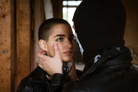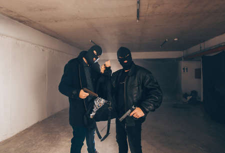 A terrorist man in hood holding gun kidnapping a man for a hostage in abandoned building. Rape, terrorism, crime, violence, robbery and killer conception.