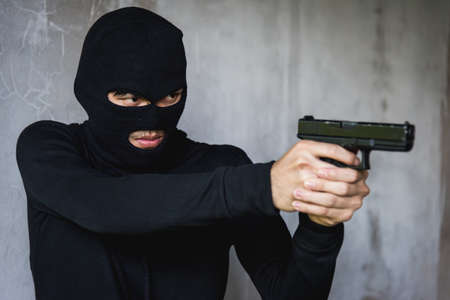 Armed robbery, thief with a pistol in gloved hand, Man in a balaclava threatens with a gun for stealing money, closeup view.