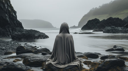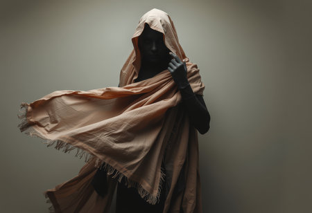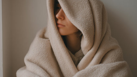 Bald person with serious expression, wrapped in a thick, dark fabric, with a piercing in one ear. Soft lighting enhances facial features, creating a dramatic, moody atmosphere