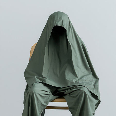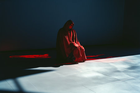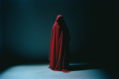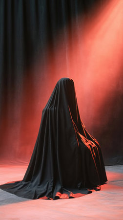 A person covered in a dark cloth, seated, with a red light illuminating the scene, creating an atmosphere of mystery and intrigue.