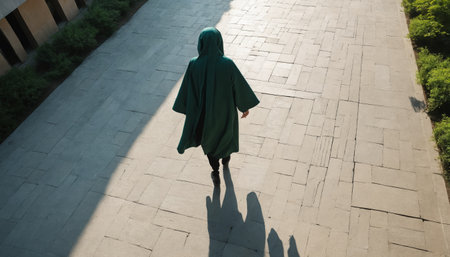 An aerial view of a person in black robes walking across a stone courtyard, surrounded by ancient stone pillars and overgrown greenery. The scene evokes a sense of mystery and intrigue, suggesting a forgotten time and place.