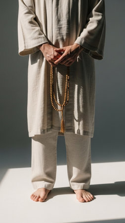 A tall, vertical, full-body shot of an anonymous person standing in quiet contemplation, holding pra