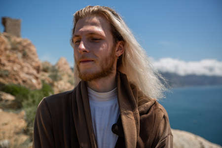 An interesting guy with a beard and long blond hair stands in a mountainous area overlooking the seascape. A fascinating journey. High quality photo