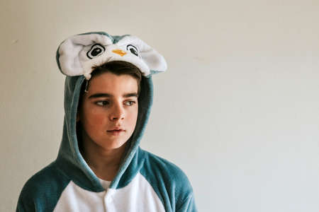 A man with a head hid in a green robe on a blue background cropped view of Copy Space