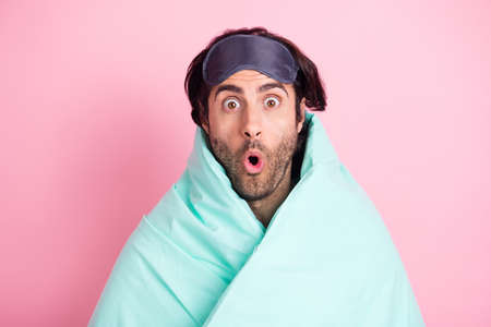 Photo of young funky funny crazy amazed man covered in blanket hear shocking news isolated on pink color background