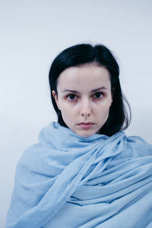 Mannequin covered with a scarf on a gray background. Studio shot.