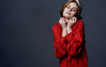 International Student's Day, world, portrait of a beautiful European student girl in a red robe, flowing hair, brunette, horizontal banner, yellow background
