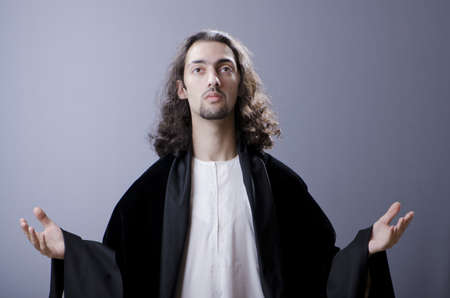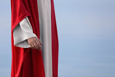 Portrait of Jesus Christ in his traditional white robe against sunset sky background.
