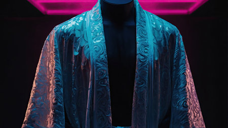 A mannequin showcases a detailed, patterned robe under striking pink lighting in a contemporary display space. The atmosphere highlights the intricate design and fabric texture.