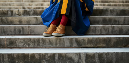 A Doctoral Graduate Clad in a Red and Blue Gown Holds a Tudor Bonnet, Casual Sneakers Completing the Look on University Steps