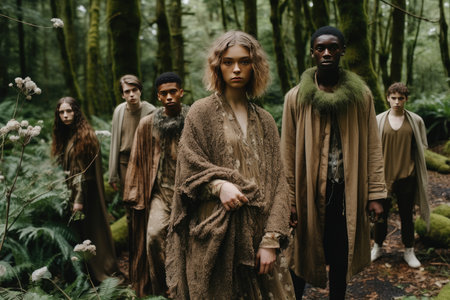 a group of people standing in the middle of a forest, with one person wearing a fur coat on his head
