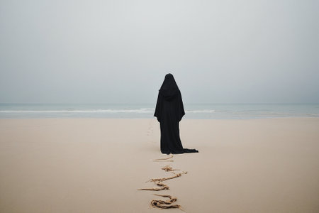 the silhouette of a mysterious figure stands out against a stark white background, surrounded by an aura of darkness, evoking feelings of intrigue and secrecy, perfect for fans of minimalist and abstract photography, black and white art, and moody visual compositions. ai generated