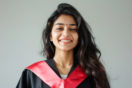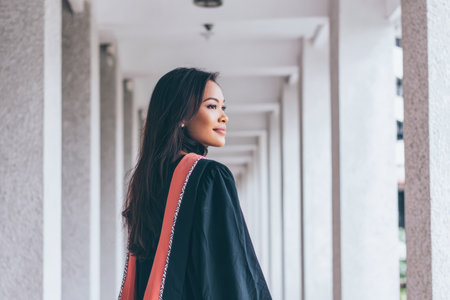 A woman wearing a graduation gown stands in a corridor with a confident smile. She looks to the side, celebrating her recent achievement at the university.
