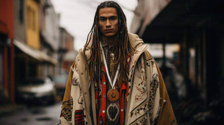 modern street fashion look with elements of authentic Native American Indian. National Native American Heritage Month concept