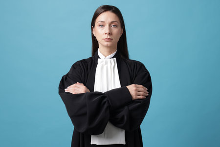 A judge is present in a courtroom. She wears a black robe and looks serious and focused. The wooden walls and courtroom setting provide a formal background for the legal proceedings.