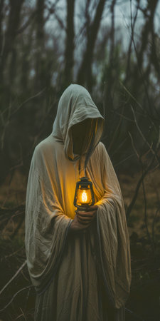 Mysterious Cloaked Figure Holding a Lantern in a Dark Forest.