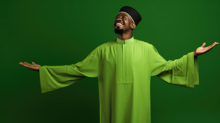 Young Muslim Guy Making Traditional Prayer To God While Wearing A Traditional Cap Dishdasha