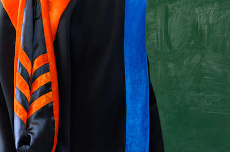 Hands carefully arrange a black graduation gown draped over a wooden chair. The image symbolizes preparation for an academic milestone, success, and the anticipation of a commencement ceremony.