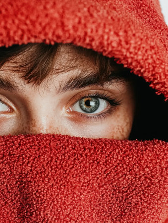 Close up of a person's face with freckles and green eyes, partially covered by a red towel.