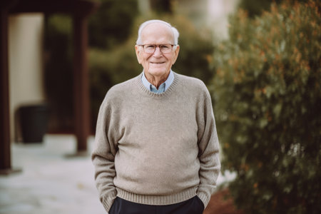 Portrait of a senior man in a sweater and glasses standing outdoors