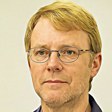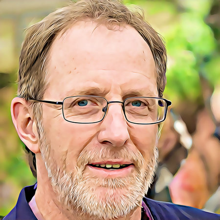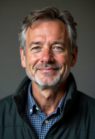 A middle-aged man with silver hair showcases a warm smile, wearing a dark jacket over a checkered shirt.