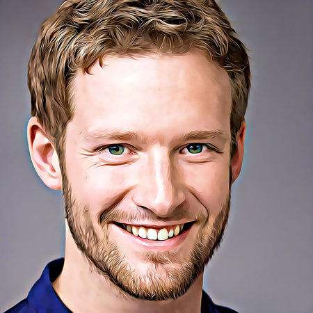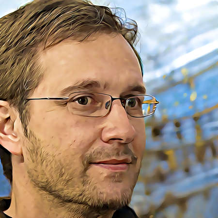 portrait of a friendly and approachable man wearing glasses and a casual shirt, standing against a bright and colorful background