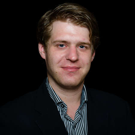 A man with a beard and glasses is smiling. He is wearing a black shirt and a black backpack