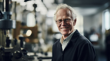A mature man with gray hair, resident of USA, smiles gently. The warm lighting creates a cozy atmosphere. Calm, confident look. Experience, professionalism and intelligence in the eyes. Generative AI.