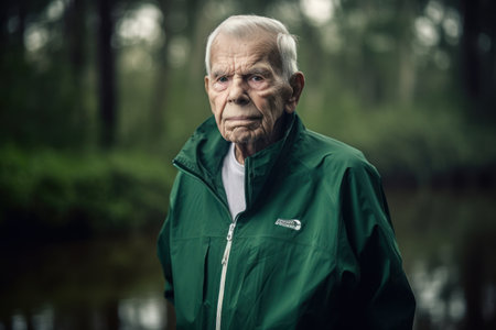 Portrait of an elderly man in a green jacket on the background of a lake