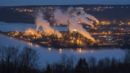 A captivating industrial landscape at night featuring a refinery complex with steam and smoke rising, illuminated by countless lights against the water.