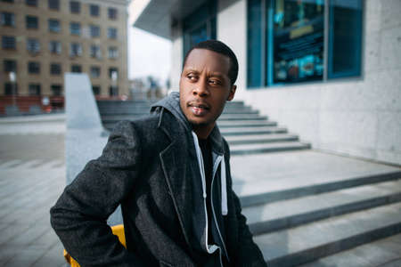 Modern stylish black hipster on urban background. Street fashion. Thoughtful looking African American man in selective focus, beauty concept