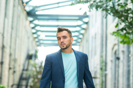 Lifestyle portrait of a young Caucasian man in casual wear on a blurred background of the urban environment.