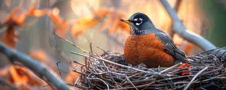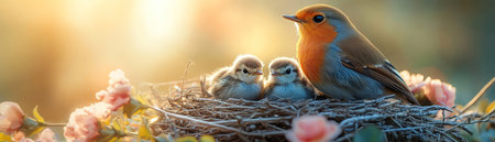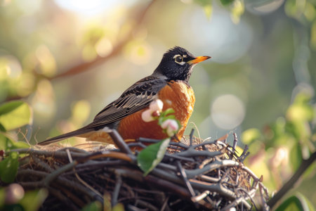 A robin sits on its nest, bathed in the soft glow of the morning sun, surrounded by blooming branches.