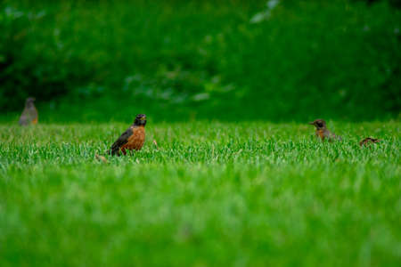 A Group of American Robin in a Field of Bright Green Grass