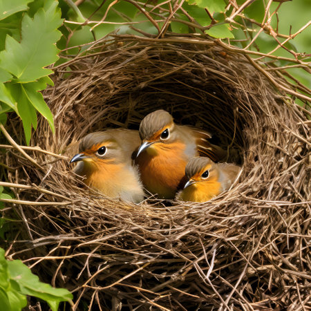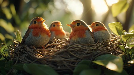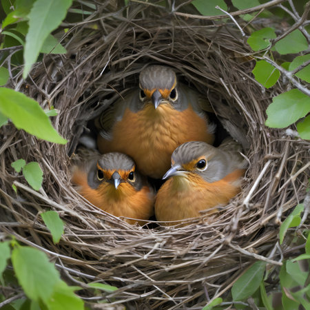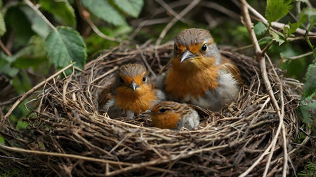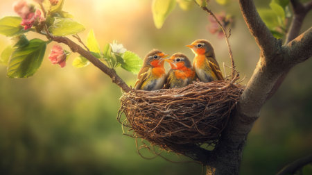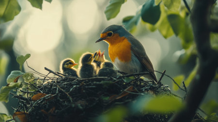 A charming scene of a parent bird feeding its hungry chicks in a cozy nest, surrounded by lush greenery, capturing the essence of nurturing and wildlife.