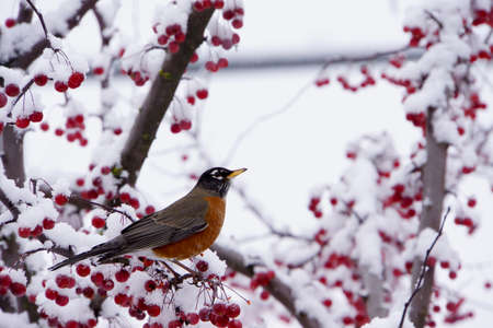 Robin in a berry tree covered in snow
