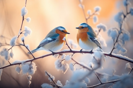 Two robin birds sitting on a branch covered with snow in winter