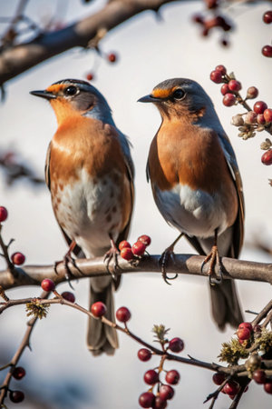 Two robin birds sitting on a branch with red berries in winter