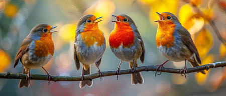 Four robins in a row with berries on either side.