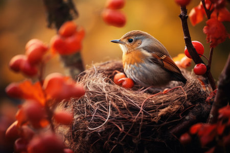 A heartwarming shot of a mother bird feeding her chicks in the nest, surrounded by twigs and leaves, showcasing the bond between parent and offspring