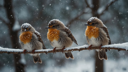 AI Generated. cute baby birds line up on snowy tree branches