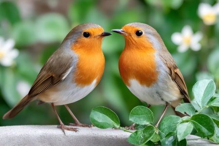 Couple of European robins perched on a low wall, facing each other on a blurred green background