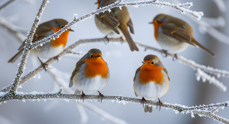 A group of five robins with bright orange breasts perch together on a frost-covered branch. The winter scene highlights wildlife resilience and natural beauty in the cold.